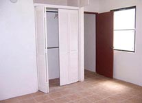 Unfurnished: spacious for your own furnishings: with wood patio/dining table set with four chairs on the patio porch. There are numerous closets, drawers, shelving throughout the apartment. Most rooms have soft overhead or wall lighting builtin. The apartment has new gas range and large refrigerator. Shared washer/dryer on premises.